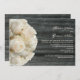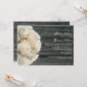 A wedding invitation featuring a background of barnwood on front and back. Front features a bouquet of white roses at left. Pesronalize the text at right with details of your occasion.