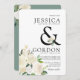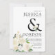 A unique white rose floral themed set of invitations tailored specifically to your future wedding. They feature a bold "&" symbol joining the names of the bride and groom.