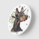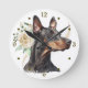 Behind the beautiful watercolor portrait of a Doberman Pinscher dog on this clock is a pretty white rose bouquet. Dark gold numbers and markers around the perimeter make the clock easy to read. Perfect for anyone who has lost their heart to a majestic Dobie.