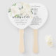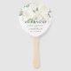 A unique white rose floral-themed set of hand fans tailored specifically to your future wedding. They feature a greeting on the front and your unique wedding details on the reverse side.