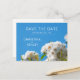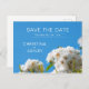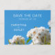 Beautiful floral wedding "save the date" card featuring dreamy white roses and a clear blue summer sky.