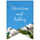 Beautiful floral wedding bunting flags featuring dreamy white roses and a clear blue summer sky.