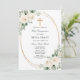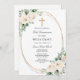 Elegant white roses are nestled in sage green leaves and decorate a gold fame. A gold cross tops the text.