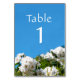Beautiful floral wedding table number card featuring dreamy white roses and a clear blue summer sky.