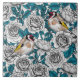 Hand drawn vector pattern with rose flowers and goldfinch birds. All elements for the pattern are drawn first with ink on paper then redrawn and coloured in Illustrator.