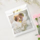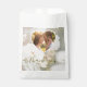 This elegant wedding favour bag design features a dreamy white rose photo by Destei faded into the background, with a heart-shaped photo template to showcase the couple. A beautiful "thank you" in flowing script sits above a personalizable text area for names, date or your own message. A romantic and personal touch for wedding guests to take home.