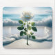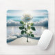 A solitary white long-stem rose stands tall in the middle of a tranquil beach while the waves gently crash around it.