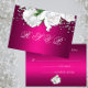 A very pretty and colourful dark pink wedding RSVP card, with a luxurious white rose bridal bouquet on the front, and a smaller white bouquet on the other side of the response card.