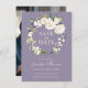 Send out lovely wedding save the date cards with a delicate white watercolor floral wreath of roses, hydrangeas, mixed blooms and trailing greenery over a popular lavender purple background. A modern hand-written script type face spells out the names of the bride and groom beautifully. The back of the card has a photo template for uploading your desired photo.