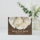 A wedding save the date featuring an image of white roses peeking from top of front over a background of barnwood. Personalise the text on front and back.