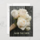 A save the date postcard featuring a photo of a bouquet of white roses with stems wrapped in burlap twine. Background is barnwood. Personalise the text on front and back.