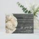 A wedding rsvp card featuring an image of white roses over a background of barnwood on front. Customise the text on front and back.