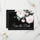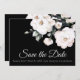 Delicate white roses on the top left corner of this elegant save the date card with black background. Wedding save the date details and additional wedding invitation and wedding website information in the back in light grey typography for contrast.