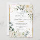 Gorgeous elegant white roses & tiny daisies surrounded with a rustic gold frame & mixed greenery of eucalyptus with other watercolor leaves wedding invitation. Clean white background adds to the elegance of this lovely design. Just exquisite. Faux gold splashes on front & back to create a chic look.