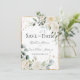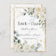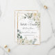 Gorgeous elegant white roses & tiny daisies surrounded with a rustic gold frame & mixed greenery of eucalyptus with other watercolor leaves wedding invitation.  Clean white background adds to the elegance of this lovely design.  Stunning.  Faux gold splashes on front & back to create a chic look.