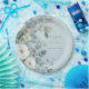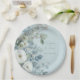 White Roses Hellebores Silver Eucalyptus floral wedding paper plate featuring elegant calligraphy script modern watercolor flowers frosty pale blue background and snowflake details