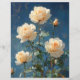 An elegant oil painting capturing creamy white roses in full bloom against a deep navy blue backdrop. The richly textured brushstrokes highlight the petals' softness and the contrast with lush green leaves, creating a timeless floral composition.