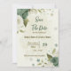Beautiful romantic wedding save the date invitation featuring sage green and ivory white flowers and some gold leaves .