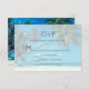 A wedding RSVP card with a tropical themed photo featuring coconut palms stretching out across a secluded white sandy beach. Turquoise waters and an azure blue sky in the background.