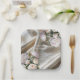 A high-resolution botanical illustration of a luxurious bouquet of white roses and white peonies against a white satin texture pattern with white snowy glitter. The arrangement features six fully bloomed peonies and three unopened buds. The largest peony in the center is pure white with delicate layered petals. To its right is a pink-peach colored peony with subtle red veining throughout. The flowers are accompanied by rich green leaves and stems. The leaves are large, glossy, and have prominent veining. The buds are a mix of light pink and cream colors, with one bud showing a deeper pink coloring at its base. The composition is symmetrical, with flowers positioned at different heights to create depth. The petals have a soft, velvety texture with subtle shadows that enhance their dimensional quality. The illustration has a painterly quality with careful attention to the natural variations in the flower petals and leaves.