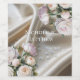 A high-resolution botanical illustration of a luxurious bouquet of white roses and white peonies against a white satin texture pattern with white snowy glitter. The arrangement features six fully bloomed peonies and three unopened buds. The largest peony in the center is pure white with delicate layered petals. To its right is a pink-peach colored peony with subtle red veining throughout. The flowers are accompanied by rich green leaves and stems. The leaves are large, glossy, and have prominent veining. The buds are a mix of light pink and cream colors, with one bud showing a deeper pink coloring at its base. The composition is symmetrical, with flowers positioned at different heights to create depth. The petals have a soft, velvety texture with subtle shadows that enhance their dimensional quality. The illustration has a painterly quality with careful attention to the natural variations in the flower petals and leaves.