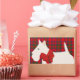 Large white space for writing a name. Stylized Scottish terrier dog with kerchief and large red bow. Plaid background with Christmas colors of red and green.