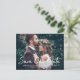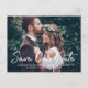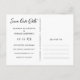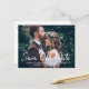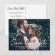 Soft and romantic, this save the date postcard features a full-bleed couple photo with elegant white brush script typography overlaid across the lower portion. The couple's names and wedding date appear in clean white sans-serif beneath the script headline. The mailable postcard reverse includes all essential details. All text and the photo are fully customisable.