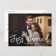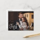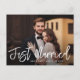 we got married, wedding announcement with white brush script. The couples image can be personalised.