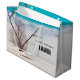 Gift bag with a gorgeous photograph. Tropical blue water and foamy surf in the background. A collection of seashells and stems set on a white sandy beach.