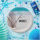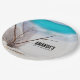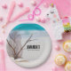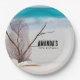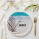 Paper plates with a gorgeous photograph. Tropical blue water and foamy surf in the background. A collection of seashells and stems set on a white sandy beach.