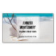 Magnetic business card with a gorgeous photograph. Tropical blue water and foamy surf in the background. A collection of seashells and stems set on a white sandy beach.
