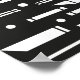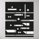 The design presents a black background with carefully arranged white geometric shapes. Long and narrow rectangles appear alongside smaller ones, forming a clean and organized structure. Several small white circles are placed between the shapes, adding rhythm and visual harmony. Triangular forms connect with rectangular elements, creating a sense of movement and unity. The overall style is minimal and balanced, highlighting the contrast between light and dark with a modern geometric aesthetic.