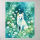 A poster of an adorable dog standing in a fantastical landscape with white flowers blooming in abundance. The pale colours like watercolors add a gentle atmosphere to your room.