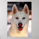 Stunning white Siberian Husky with blue eyes, ears peaked, staring straight into the camera. This sled dog is a photo portrait of the perfect sled dog, able to run all day and good in temperatures down to 60 below zero, Farenheit. If you love northern breeds and sled dogs, you'll admire this one every day.