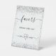 A stylish white background, decorated with faux silver glitter sparkles. With the text: Favours. Please take one. Mr and Mrs with a heart