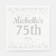 Elegant and modern white with silver glitter woman's 75th birthday party paper napkins personalised with a name and age.  All text is customisable.