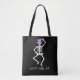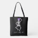 A fun tote bag for Halloween with this design on both sides of the tote. This white Halloween skeleton is dancing a jig on a black background and is extending an invitation for you with the words to Dance with Me or you can delete those words and add your name to personalise. The hand painted original art features a dancing skeleton with a purple top hat on his skull. This skeleton is part of three dancing skeletons that are available on other products as 2 or 3 skeletons. Check for my other products with this art for ghoulish products for Halloween. The original art is from Phyllis Dobbs who wishes you a happy and ghoulish Halloween.