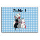 This table number card for your parties and events is a light blue and white plaid pattern with a smiling mother white cat sitting with her three kittens who are black, white and grey wearing pink bows around their necks. customise the table number with the template.