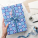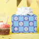 Paper snowflake-inspired snowflakes atop dark blue squares alternate with empty light blue squares on this wintry design.