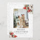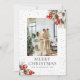Elegant botanical photo Christmas card featuring a watercolor painting of poinsettia, conifer tree branches, holly and red berries against a snowy background. Easily personalize this holiday card with your photo and text.