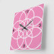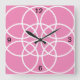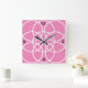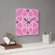 Pretty wall clock featuring white spiral circles on a pink background. Numbers can be removed or changed.