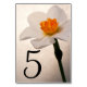 Customise these elegant White Spring Daffodil Table Numbers and create a different card for each table at your March, April or May springtime marriage reception, bridal shower or garden party. These classy custom flowery table number cards feature a floral photograph of a white daffodil flower blossom with an orange centre or narcissus geranium on the stem with a beige background.