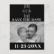 This Save the Date postcard showcases elegant white initials and stripes against a sleek black background, creating a sophisticated and timeless design. The couple's initials are beautifully displayed within a round frame with small hearts on both sides, adding a personal touch to the card. In addition to the stylish design elements, the postcard also includes the wedding date prominently featured, ensuring that guests can mark their calendars well in advance. The photo of the couple adds a warm and personal touch, making the card a cherished keepsake for both the couple and their loved ones.