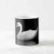 White mute swan floating in a lake with reflection in the water against black background. Low key.