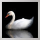 White mute swan floating in a lake with reflection in the water against black background. Low key.