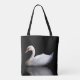 White swan on black tote bag