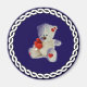 White Teddy Bear, oh so cute, on navy blue solid colour, white braided circle frame.