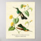 Vintage natural history illustration by Antoine-Germain Bevalet, c. 1874, of the White-throated Mountaingem hummingbird (Lampornis castaneoventris.) Two bright green hummingbirds with black and white face masks perch on a tropical vine (Convolvulus jalappus) with yellow flowers, with a light golden yellow parchment texture background. Digitally cleaned and enhanced while still retaining its vintage characteristics. Features common and scientific names in decorative fonts. Sized to fit standard frame.