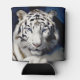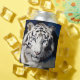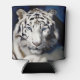 A striking white tiger with blue eyes looking straight at you, against a dark and, dreamy background. A bold and captivating image perfect for animal lovers.