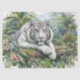 This tissue paper features an elegant white tiger relaxing on a moss-covered fallen tree in a lush jungle.